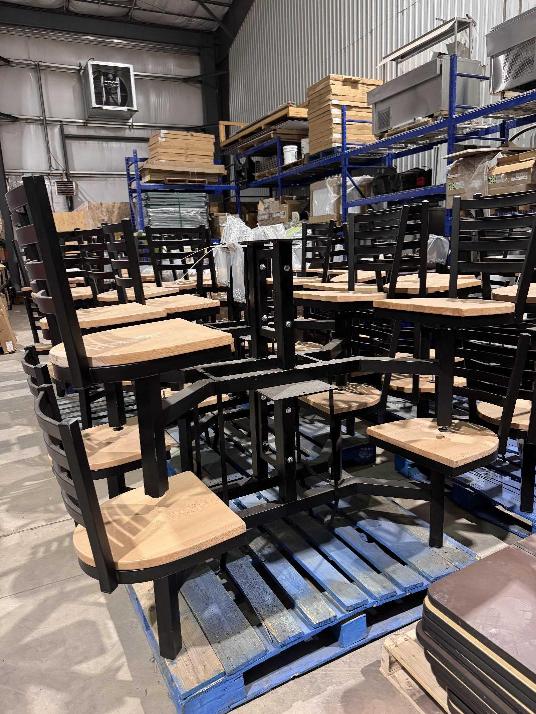 Five (5) complete sets of cafeteria tables. Each table set measures approximately 83.5 inches in length by 35.5 inches in width and includes eight (8) matching chairs. All items are Being Sold AS IS, WHERE IS, with no warranties or guarantees expressed or implied.